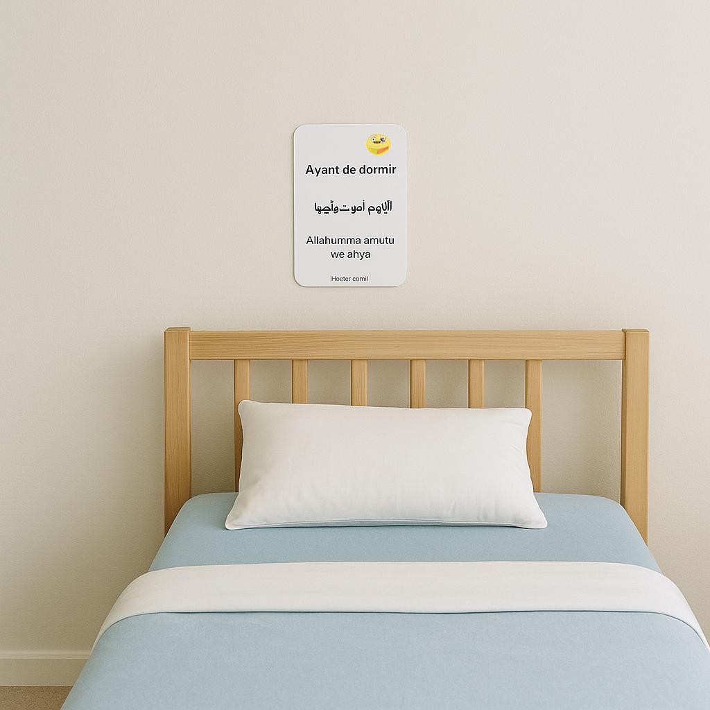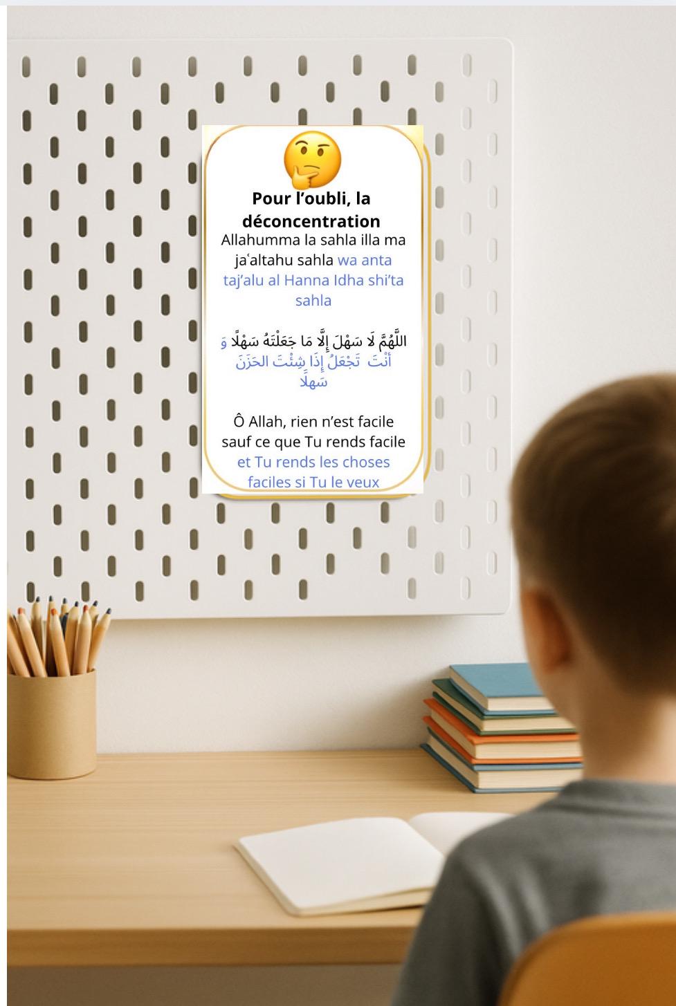 * Affichées dans des lieux stratégiques (porte des toilettes, lit, coin prière, table, cartable...)