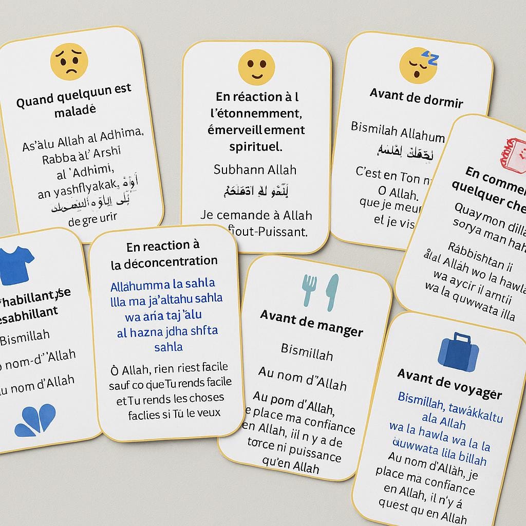 Ces 24 cartes illustrées l'accompagnent dans sa vie quotidienne pour apprendre, comprendre, réciter et vivre les invocations (dou'a) avec joie et simplicité.