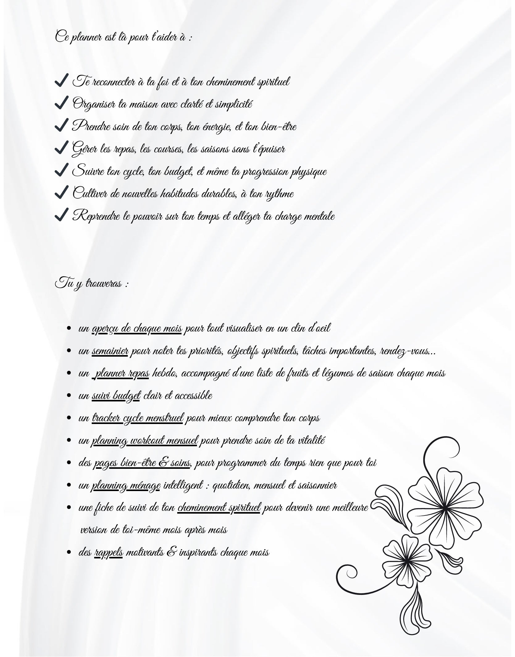 ✅ Une organisation claire et motivante sur 12 mois Aperçus mensuels avec intentions et objectifs Semainiers guidés avec to-do list, menus et suivi personnel Suivi du cycle menstruel, du budget, de la routine beauté, des tâches ménagères