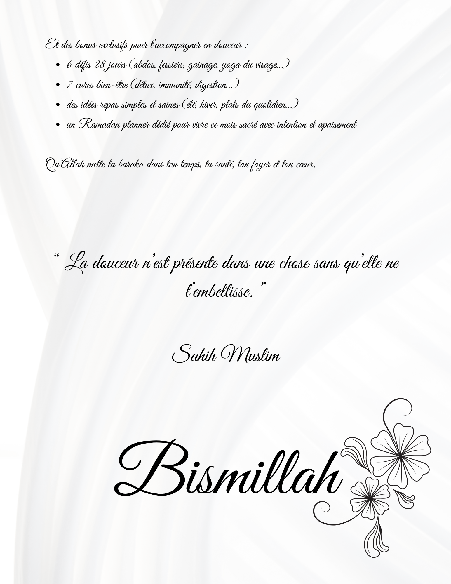✅ Des espaces pour te reconnecter à l’essentiel Fiche mensuelle “Mon chemin intérieur” (intentions, objectifs, développement personnel et spirituel) Des défis 28 jours : sérénité, désencombrement, abdos, gainage…. Des cures bien-être : vitaminée, immunité, détox… Des pages dédiées au mois de Ramadan pour élever ton âme, cultiver la gratitude, et t’encourager à la lecture du Coran